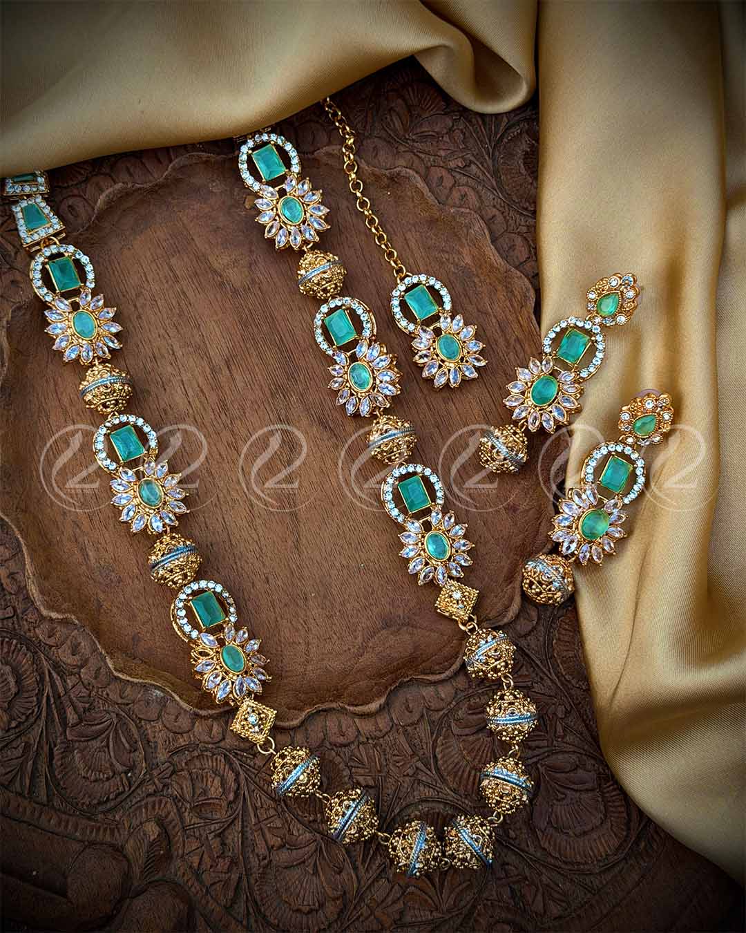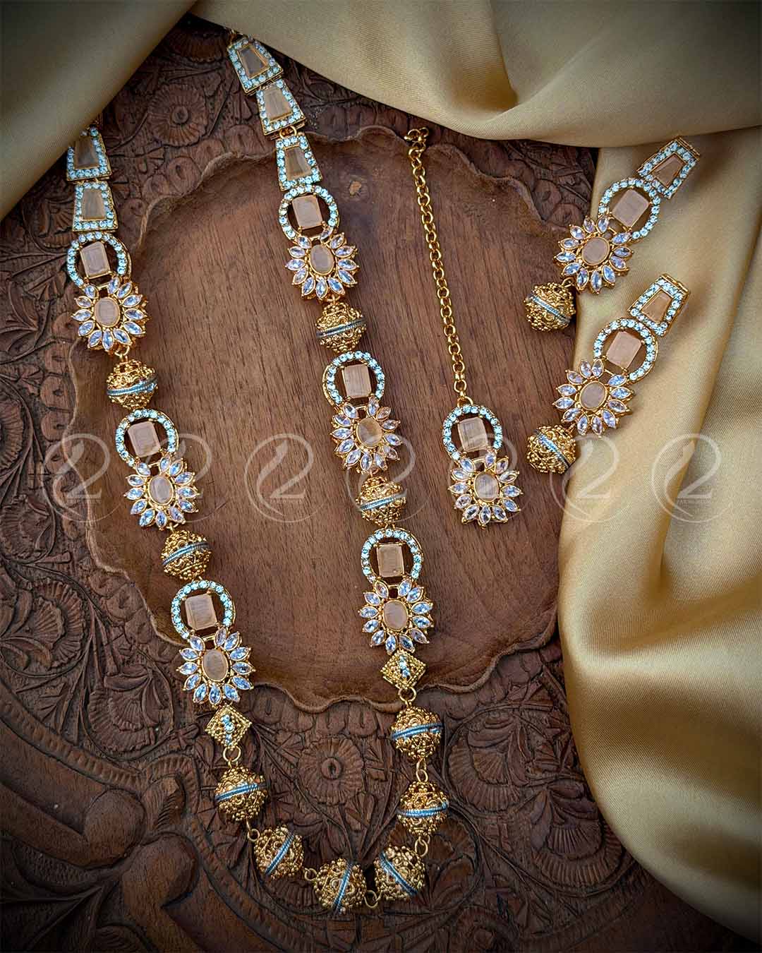 Crafted with a premium traditional matte-gold finish, this jewelry piece features intricate hand-crafted detailing and is beautifully embellished with lustrous pearls and radiant stones.